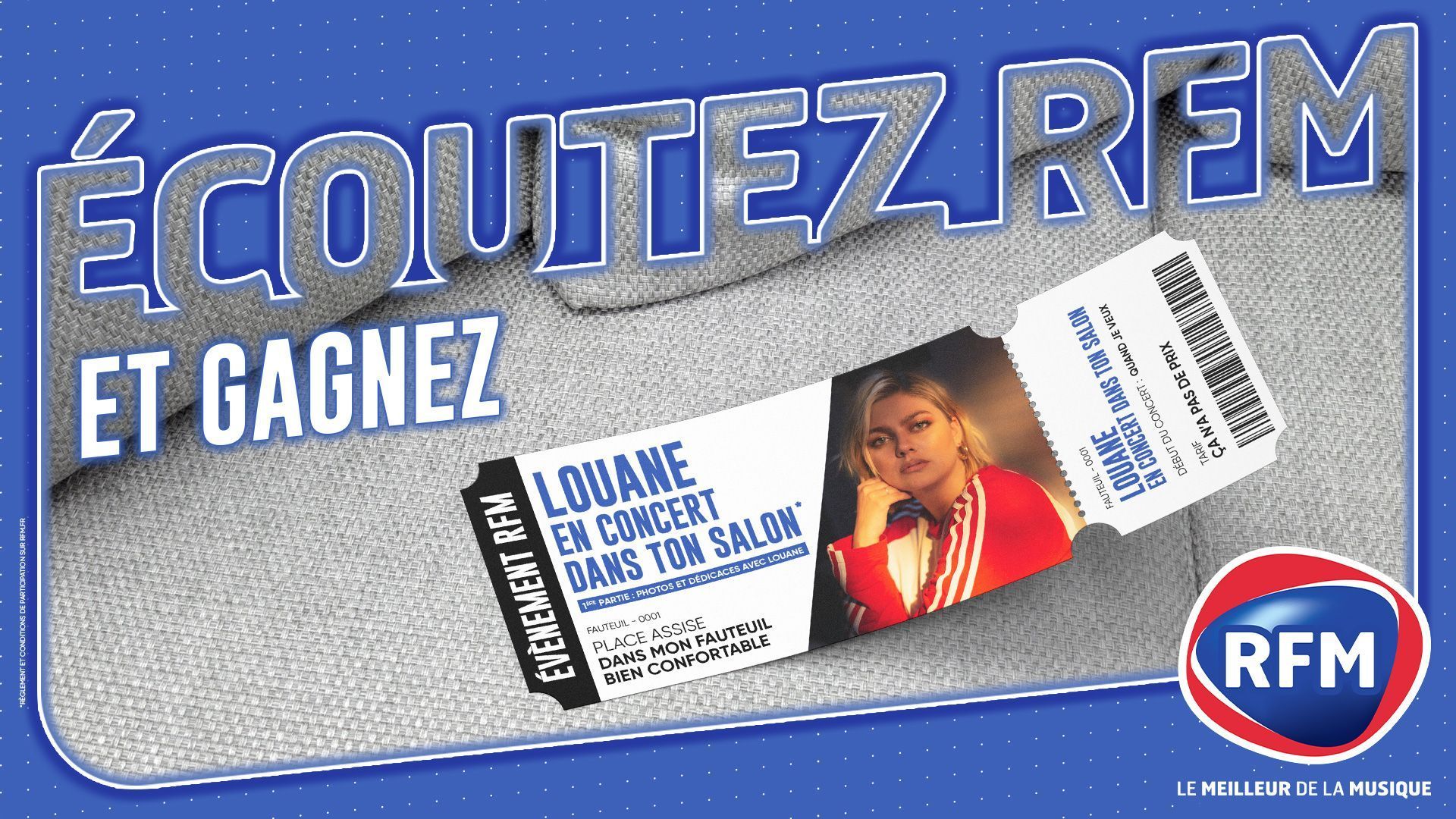 Et si Louane venait chez vous interpréter les titres de son dernier album et ses tubes incontournables ? Faites de la place, poussez les meubles, invitez vos amis et préparez-vous à recevoir Louane dans votre salon ! Du 29 janvier au 11 février tentez de remporter ce cadeau unique, rien que pour vous et ceux que vous aimez. Pour participer à notre jeu, écoutez RFM, au signal envoyez par SMS le code LOUANE au 73916 (3x75cts + coût SMS).