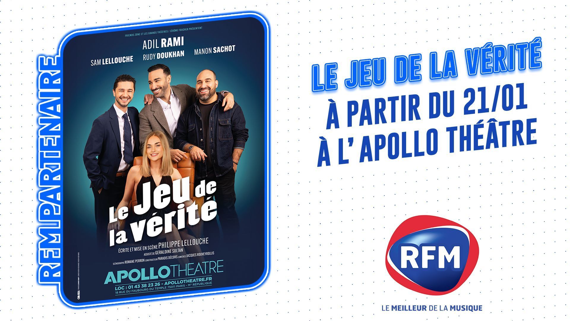 La pièce de théâtre de Philippe Lellouche "Le jeu de la vérité", est de retour sur la scène de l'Apollo Théâtre à partir du 21 janvier 2026 , en partenariat avec RFM.